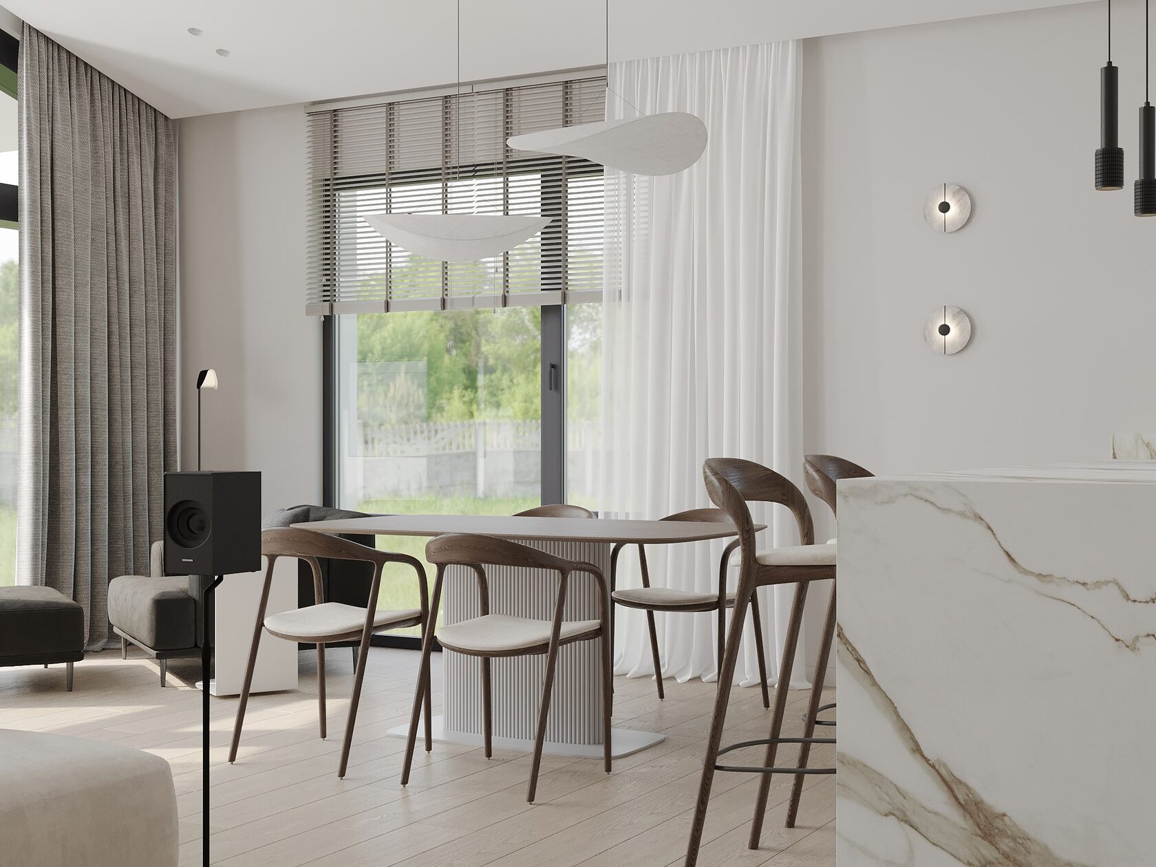 • Обеденная зона: если гостиная совмещена со столовой, разместите обеденный стол со стульями. Важно, чтобы эта зона была обособлена, но при этом гармонировала с общей концепцией.