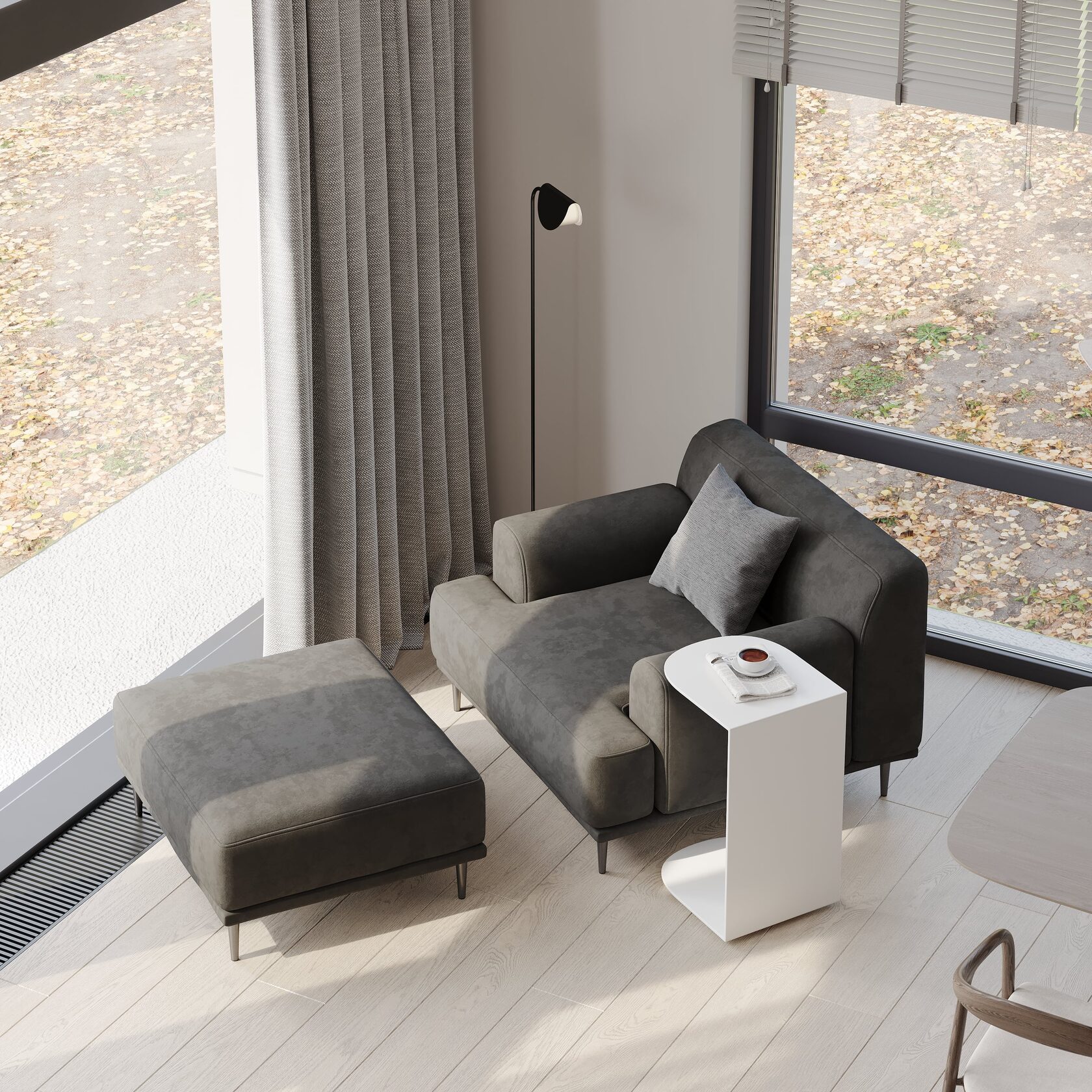 • Зона для чтения/релакса: уютное кресло с торшером и небольшой книжный шкаф или стеллаж. Возможно, отдельный диванчик у окна.